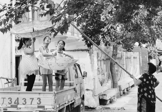 昨天,在嵊州市甘霖镇苍岩村的一棵朴树旁,村民正在采摘成熟的朴树果实。这种果实略带甜味、黑色,口感可与蓝莓媲美,是小村里特有的佳果。 (记者 张亮宗 摄)