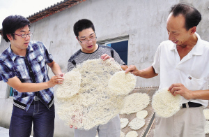 榨面是嵊州市的传统小吃之一。8月26日,从业人员手工榨面“直径之最”的比赛在嵊州市殿前食品有限公司举行。经过现场测评,直径70厘米的一张榨面直径最大,在比赛中胜出。图为比赛人员展示最大手工榨面的现场。 (记者 张亮宗 摄)