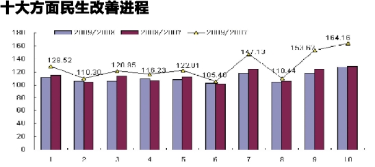 从民生改善十大方面看,与2008年相比,2009年收入分配与公平、教育均衡发展、文化与体育等三个方面改善进程有所加快。与2007年相比,弱势人群保障、保障性住房、人居环境与环境保护等三个方面推进速度较快,居前3位,年均增速在20%以上。