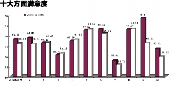 2009年11-12月,省统计局民生民意调查中心对11个市区、58个县(市)随机抽取样本13900户,其中城镇居民住户占70.6%,农村住户占29.4%,通过电话调查方式进行问卷调查。同时,在全省11个市抽取752户低保户,采取入户的方式进行调查。调查内容包括食品药品安全、社会保障、环境保护、就医、受教育、安全感、政府公开办事、突发事件处理、就业和收入等十大方面。调查结果显示,虽然2009年处于国际金融危机的深刻影响之下,但民生满意度整体有所提升,2009年浙江省民生满意度为68.23,比上年提高2.21个点。从调查的各方面看,就业、安全感、突发事件处理和受教育满意度均在70以上,居十大方面前4位。其中,就业满意度为78.57。虽然2008年底和2009年初就业形势较为严峻,但自2009年二季度开始出现好转。安全感、对突发事件处理和受教育的满意度分别为73.10、73.07和72.66。对食品药品、就医、社会保障、收入和环境保护等五个方面满意度分布在60-70之间。满意度最低的是对政府公开办事方面。另外,生态环境保护方面也是较为薄弱的环节之一。