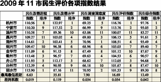 2009年,杭州市在医疗与健康、文化与体育、保障性住房等三个方面民生改善水平居11个市首位;宁波市在就业与社会保障、人居环境与环境保护、弱势人群保障等三个方面民生改善水平居11个市首位;舟山市在公共财政民生投入、教育均衡发展等两个方面民生改善水平居11个市首位;嘉兴市在收入分配与公平方面改善水平全省最高;温州市在公共安全方面民生改善水平全省最高。