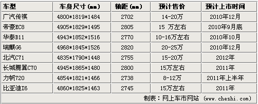 从上表可以看到,这八款新车型瑞麒G6的尺寸最大,车长2968mm、轴距达2820mm,其次是长城腾翼C70,而最先推向市场的很可能是帝豪EC8,预计售价15万左右,搭载2.0L和2.4L发动机。刚刚下线的传祺将于广州车展上市,预计售价14-20万元之间。