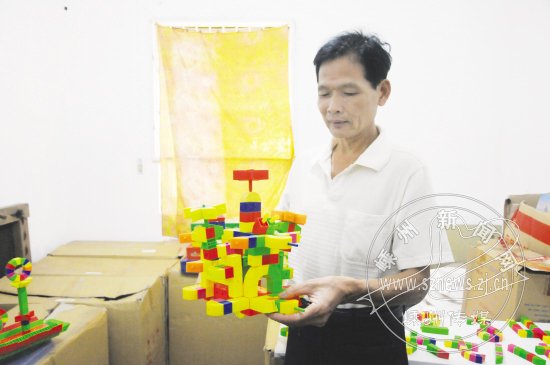 他就是张彩中。他获得了一种玩具专利,可以用18种不同的塑料玩具模块,拼装出各种各样的玩具。