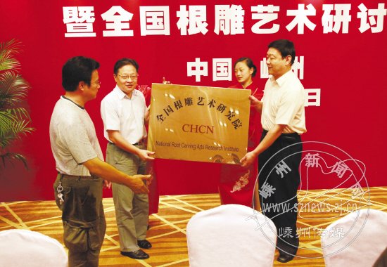 穆道荣宣读了CHCN全国根雕艺术研究院成立任命文件,并与郭敏一起为全国根雕艺术研究院授牌,省根艺美术协会主席郑剑夫担任全国根雕艺术研究院首任院长。