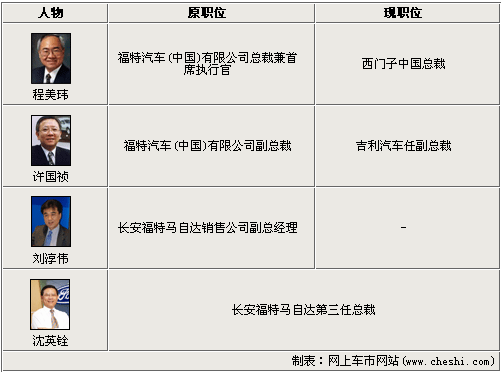 在1995年,出生于台北的许国桢加入福特,担任台湾福特六和汽车股份有限公司副总经理,并在1998年加盟福特中国担任副总裁。与此同时,出生于台湾新竹的程美玮也加入福特中国,任董事长兼首席执行官,并参与福特与长安合资谈判等一系列重要项目。9年后的2007年,同样来自台湾福特六合的沈英铨成为了长安福特马自达第三任总裁,当然还包括同样出身六和的刘淳伟,其担任长安福特马自达销售公司副总经理,应该说此时台湾派已经全面掌控福特中国市场。