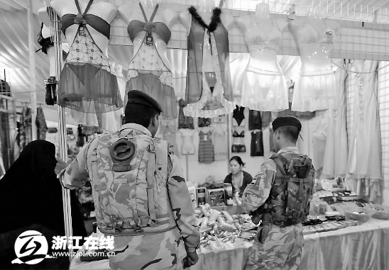 中国老板和伊拉克伙计们忙得不可开交地接待着穿着黑纱和白袍的巴士拉顾客。买东西都是以伊拉克第纳尔或美元结算的,一支小孩玩的泡泡枪,售价相当于27元人民币;一幅装饰画,50元;两条儿童长裤,28元……