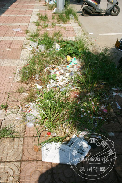 客运中心附近的华联超市北边的人行道上,因经常不打扫,垃圾成堆,杂草丛生,旁边的店家有口难言,行人到此不由得皱起眉头。