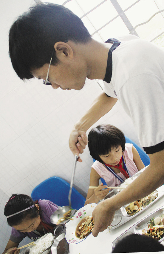 嵊州市贵门乡是当地的高山乡镇,9月10日,贵门乡中心学校的青年教师们自己出钱,为当地的50余位贫困生做营养餐,在教师节里给了贫困学生们一份关爱。图为10日中午,教师应奇亮正在为学生添菜。