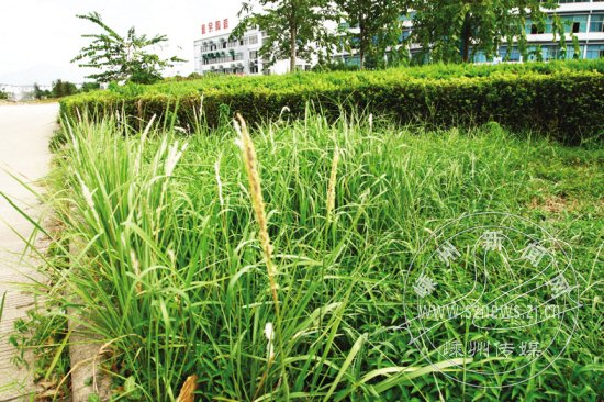绿化带是城市的风景。市普田大道中段的绿化带苗木经常修剪,郁郁葱葱,但其中一小段绿化带中长满了荒草,看去不够协调。 (绿野)