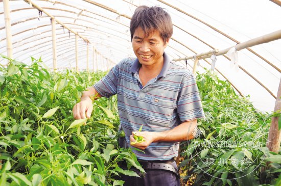 眼下正是小辣椒成熟季节,连日来,市经济开发区宕头村大棚蔬菜基地菜农正在抓紧采摘小辣椒。宕头村大棚蔬菜基地面积有300多亩,主要种植蒲瓜、小辣椒、丝瓜等。现在小辣椒批发价每公斤7—9元,该基地每天有1500公斤供应市区及周边市场。图为菜农在大棚内采摘小辣椒。