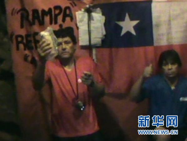 9月18日,智利圣何塞铜矿一名被困矿工在矿井里手持地面上传送的食品(电视截图)。当天是智利独立200周年纪念日。与此同时,被困矿工的救援工作也取得突破性进展。智利政府17日证实,T-130型钻机当天打通一条救援通道,朝救出33名矿工迈出了重要一步。新华社/路透
