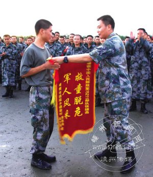 9月4日下午,市武装部领导千里迢迢赶赴广州军区某团海训场,向嵊州籍战士张捷杰授予“嵊州市见义勇为先进分子”称号。“碰到这样的事,我想即使我没穿军装,我也会跳下去救人的,同样别人看见了肯定也会这样做的。”谈到一个多月前在老家休假期间勇救落水女孩的事,张捷杰显得十分平静。