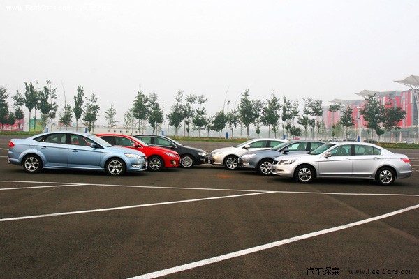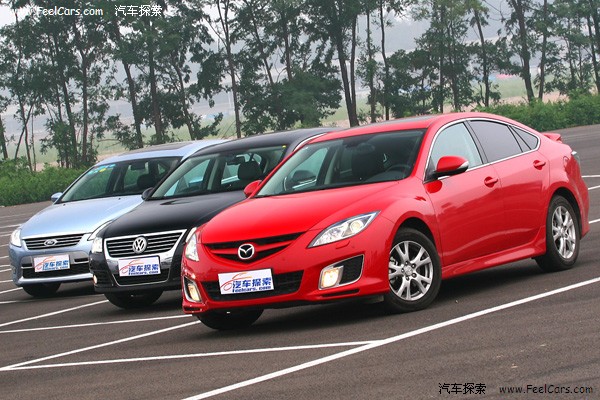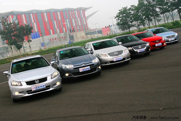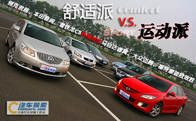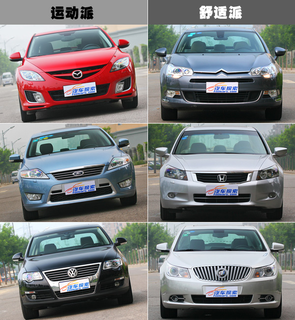 当马自达睿翼轿跑,雪铁龙C5,蒙迪欧致胜,本田雅阁,大众迈腾以及别克君越这六款车分别行驶在路上的时候可能没有什么回头率,毕竟都是满大街跑的车型,可以唯一回头率高一点的就是睿翼轿跑,毕竟刚上市,外加上火辣的红色车身都回显得惹眼一些。但如果这六辆车排成两排,以两个阵营出现的话,场景还是比较壮观的。我们把睿翼,致胜还有迈腾分为一组,命名为运动派;而C5,雅阁,君越为另一组,称舒适派。看看仅从外观而言,它们是不是符和我们给它们定下的身份。