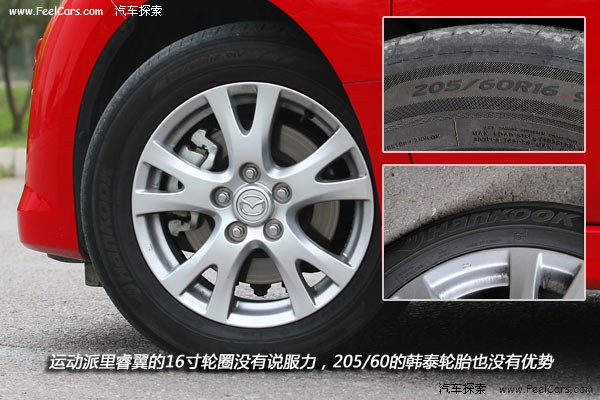 除了侧面线条之外,车轮也绝对是影响视线的另外一个关键因素。睿翼的分叉五辐轮圈样式很不错,就是16英寸的尺寸有点寒酸了,它不仅是运动派里最小的,而且匹配的韩泰205/60的轮胎也是最窄的,品牌比较平庸的。