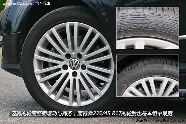 迈腾的17寸20辐轮圈是运动与商务一个不错的结合体,与整体外观设计相当吻合。所配备的固特异235/45的轮胎是运动派里最宽的,就从这一点来说,迈腾骨子里还是具备相当的运动潜能。