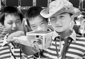 近日,嵊州市剡山小学举办的“低碳生活”小制作艺术品比赛在该校集中进行作品展示。图为学生们正在观看同伴研发的太阳能迷你小汽车。 (记者 张亮宗 摄)