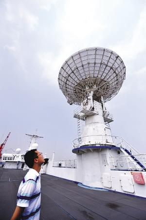 驶离中国海域、穿越琉球岛链公海的那天中午,我在房间突然接到电话:“焦记者,快到甲板上去,有日本飞机。”记者来到甲板上,果然看见离船不远处,一架日本飞机在空中盘旋。老船员们告诉记者,每次船出海到这里都会碰到日本飞机的例行陪伴,不过对方只是“跟踪”,不敢造次。到了下午4点多,船上举行了一个向祖国再见的仪式。这时,又有一艘船头上写着“132”编号字样的日本自卫队军舰前来,两船相隔不到1000米的样子,我们的船开多快,这艘日本军舰就用同样的速度在那边跟着。在它的“陪伴”下,雄壮的国歌在远望六号船的后甲板奏起,五星红旗冉冉升起,船员们向祖国庄严宣誓,保证完成任务,不辱使命。