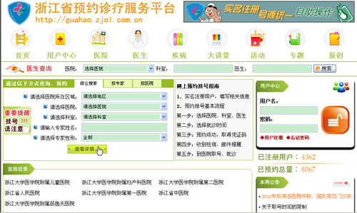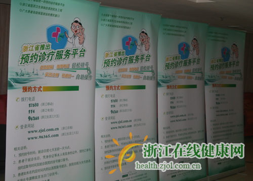 9月27日下午,浙江省卫生厅举行“浙江省医院预约诊疗服务平台”启动仪式。患者可以登陆浙江在线网站(www.zjol.com.cn)点击“挂号”栏目,或者直接输入(http://guahao.zjol.com.cn),通过实名身份注册,选择医院专家,即可预约即日起7日内的各大试点医院专家号,凭订单号和身份证,即可到医院的挂号窗口取号,按专家等级付相应挂号费,平台上预约挂号免收服务费。