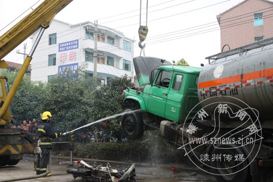 昨日上午11点10分左右,在104国道新昌方向与领带园三路交叉口附近,一辆车牌为浙DET762d的摩托车与一辆车牌为浙DD335挂的槽罐车相撞。摩托车主在事故中受伤,并被送往市人民医院抢救。