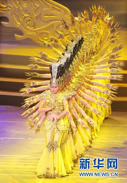 10月1日,在世博中心举行的中国国家馆日文艺晚会上,中国残疾人艺术团演员表演“千手观音”。当日,上海世博会中国国家馆日文艺晚会在世博园的世博中心举行。 新华社记者凡军摄