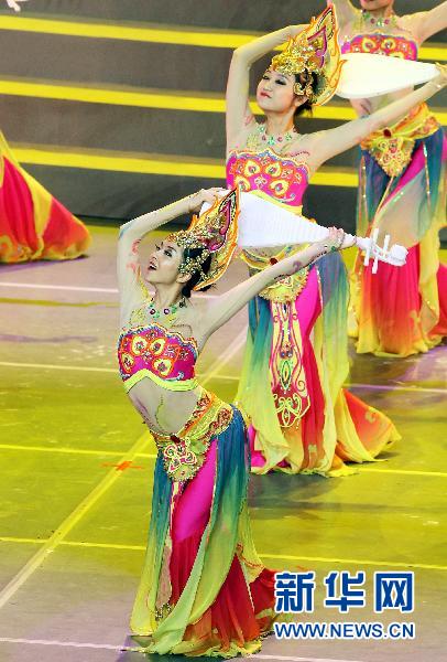 10月1日,在世博中心举行的中国国家馆日文艺晚会上,演员在表演舞蹈《敦煌情韵》。当日,上海世博会中国国家馆日文艺晚会在世博园的世博中心举行。 新华社记者凡军摄