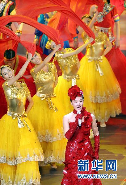 10月1日,在世博中心举行的中国国家馆日文艺晚会上,宋祖英演唱《让我们舞起来》。当日,上海世博会中国国家馆日文艺晚会在世博园的世博中心举行。 新华社记者凡军摄