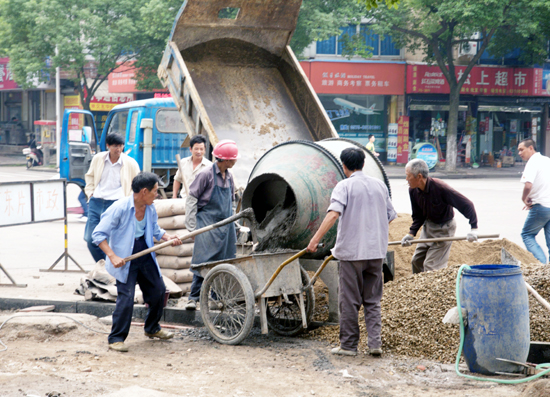 国庆期间,市政人员和环卫工人坚守在岗位,市政工人在官河路和越秀路地段修建人行道