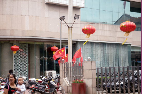 街头经常可以看到红旗飘飘和彩灯高挂的场面