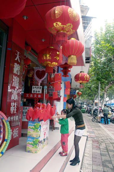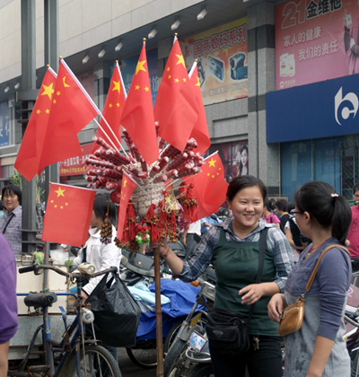 连卖冰糖葫芦的大姐也插起了国旗,笑呵呵地欢庆国庆
