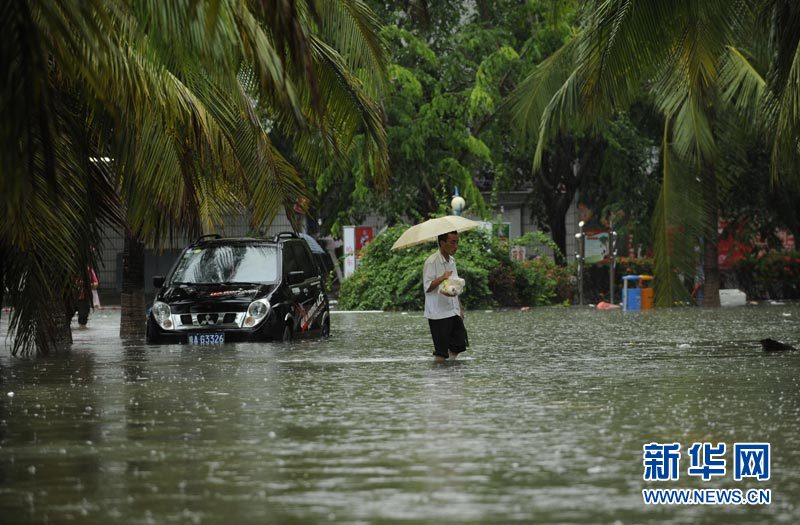 海南持续降雨 市民出行受影响 10月4日,市民涉水通过海南三亚市积水路段。海南省气象台于10月4日9时10分继续发布万宁、陵水两个市县暴雨红色预警信号和三亚、琼海、海口等13个市县暴雨橙色预警信号,并发布了强风警报。据气象部门统计,9月30日夜间以来,海南岛东部、中部和南部地区出现连续强降水天气,给市民出行和生活造成一定影响。10月3日至5日,海南全岛各地仍将遭受暴雨或大暴雨袭击,气象部门提醒,此次降水过程持续时间长,累积雨量大,有可能在东南部和中部山区引发洪涝和地质灾害。新华社发(徐勤涛 摄)