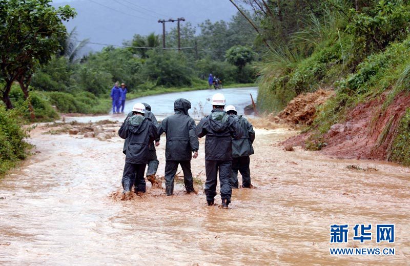 海南陵水吊罗山地区发生一处山洪 10月4日,通往吊罗山林区山体滑坡现场的道路上,洪水从山上流下。当日8时20分左右,距海南省陵水县吊罗山林区山体滑坡现场约8公里处的山区突发山洪,通往吊罗山林区的唯一救援道路被堵塞。经过当地有关部门与武警消防部队的紧急抢修,9时20分左右,大型车辆与越野车辆可以通过。新华社记者 侯建森 摄