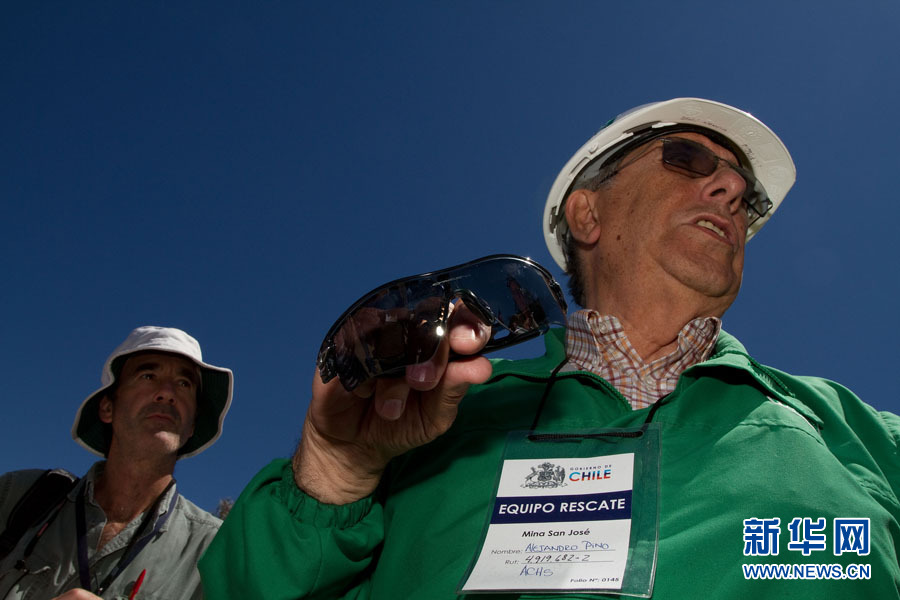 10月7日,智利矿难救援人员亚历杭德罗·皮诺(右)在圣何塞铜矿展示一副特制的墨镜,这是为避免两个月未见阳光的矿工们回到地面时眼睛受伤而准备的。智利政府7日说,圣何塞铜矿一口救援井有望9日打通,受困矿工最早可能下周获救。智利圣何塞铜矿的33名矿工被困700米深的地下已达两个月。新华社发(马丁·萨巴拉摄)