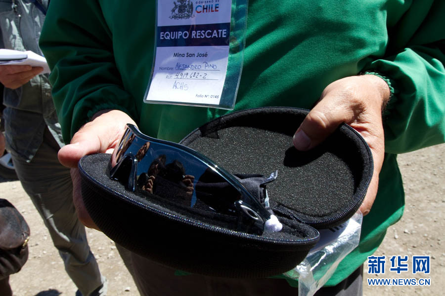 10月7日,智利矿难救援人员在圣何塞铜矿展示一副特制的墨镜,这是为避免两个月未见阳光的矿工们回到地面时眼睛受伤而准备的。智利政府7日说,圣何塞铜矿一口救援井有望9日打通,受困矿工最早可能下周获救。智利圣何塞铜矿的33名矿工被困700米深的地下已达两个月。新华社发(马丁·萨巴拉摄)
