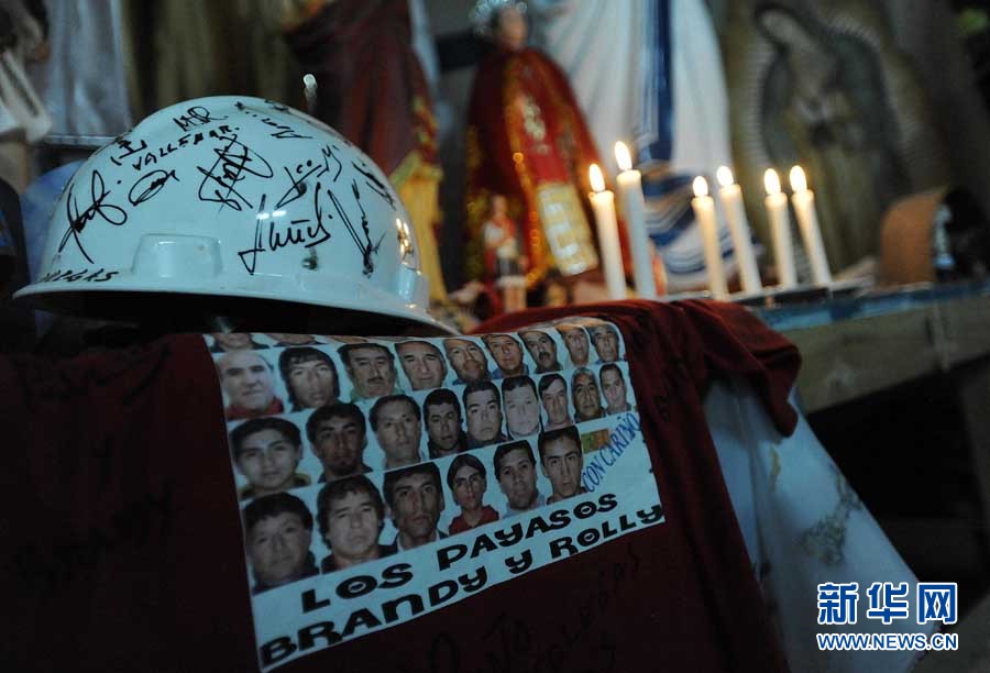 10月7日,在智利首都圣地亚哥以北800公里的圣何塞铜矿,工棚内摆放着被困矿工的图片和带有被困矿工亲笔签名的安全帽。智利圣何塞铜矿8月5日发生塌方事故,33名矿工被困700米深的地下已达两个月。救援行动虽然困难重重,但是进展顺利,矿工有望在短时间内升井获救。新华社发(豪尔赫·维耶卡斯)