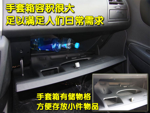 东风雪铁龙2011款世嘉三厢的手套箱有阻尼设计,在打开手套箱后不会因重力而自由下落,手套箱内部空间很大,能够存放不少东西。手套箱内配有储物格,可以存放小件物品。