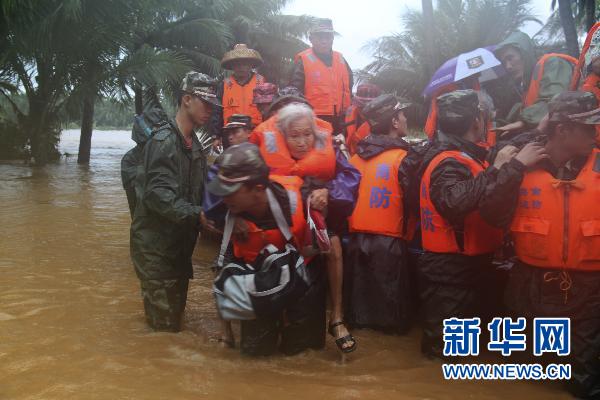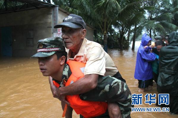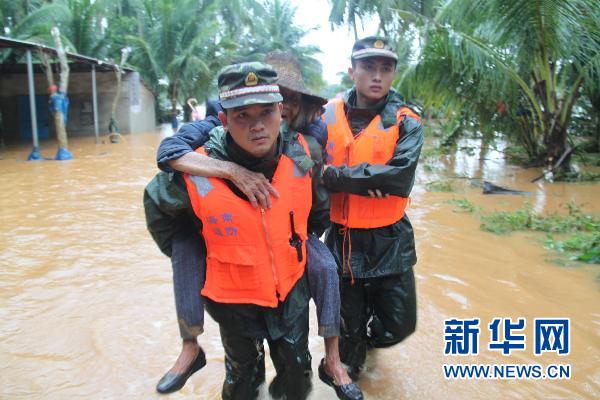 10月8日,海南边防总队文昌边防支队官兵在受灾严重的文昌市会文镇鸿山村转移受灾群众。
