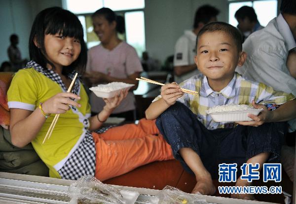 10月8日,安置区内的一对姐弟正在吃午饭。