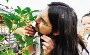 4日,一位来嵊州游玩的南美游客捧起桂花细品芳香。嵊州市是全国花木之乡,该市数百公里公路两侧多为花木田园,成为百里花木长廊。国庆期间桂花树花儿盛开,吸引不少游客驻足。 (记者 张亮宗 摄)