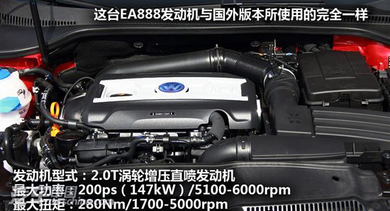 高尔夫GTI配备了与迈腾2.0T相同的2.0升缸内直喷涡轮增压发动机,其最大功率为147kW/5100-6000rpm,最大扭矩为280Nm/1700-5000rpm,搭载了大众最新的7速DSG干式双离合变速箱。让人比较遗憾的是国产GTI并没有推出手动档车型供消费者选择,多少让有些遗憾。GTI偏高的价格和偏低的实用性使其注定只是一款小众车型,但它的上市无疑为国产车型做出了新的性能标杆。