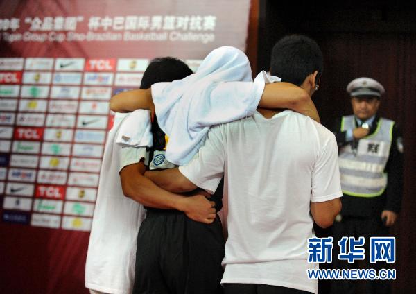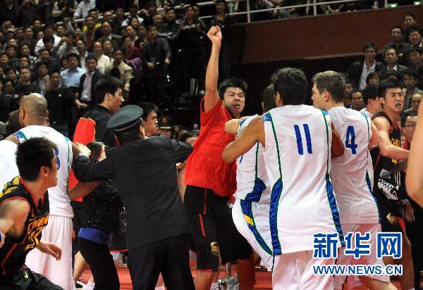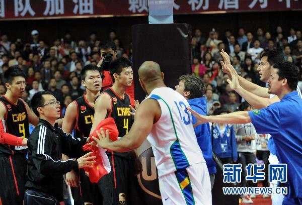 10月12日,中国队球员(左)与巴西队球员(右)在场内发生肢体冲突。