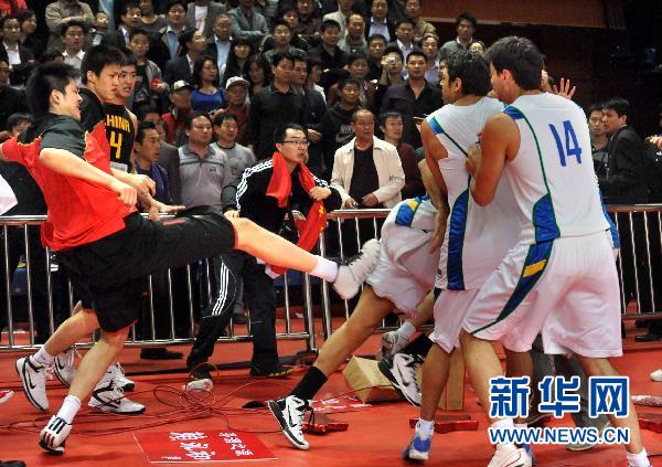 10月12日,中国队球员(红衣)与巴西队球员(白衣)在场内发生肢体冲突。