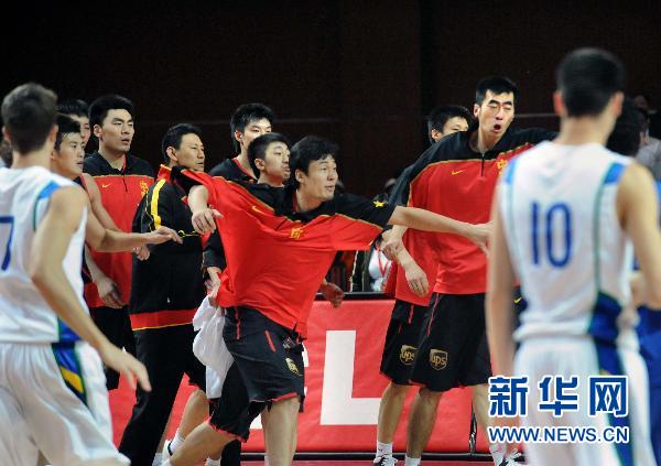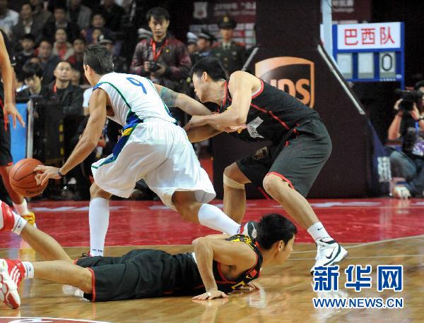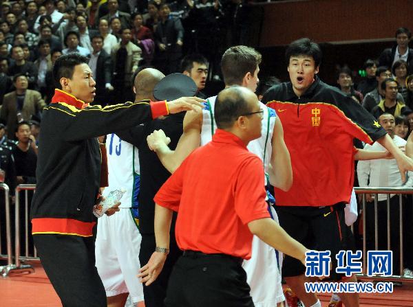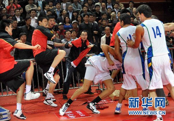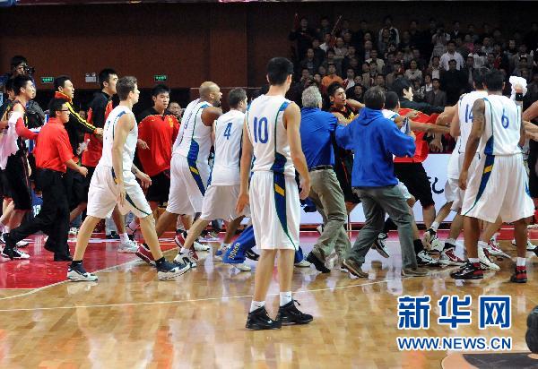 10月12日,中国队球员(左)与巴西队球员(右)在场内发生肢体冲突。