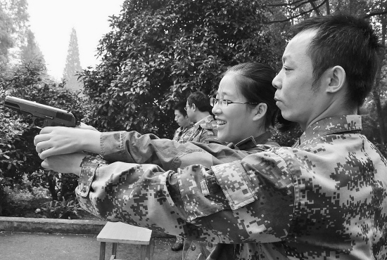 昨日,嵊州市参加企业武装部的部长们,在该市人武部的组织下进行军事日活动。图为靶场上,一位企业的女人武部部长正在军事干部指导下,练习手枪射击。 (记者 张亮宗 摄 通讯员 胡辅彬 文)