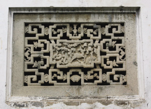 但更多的台门,外表的硬挺只是一个假象。比如接下去我们很快看到的下新屋。需要补充一点的是,白泥坎的古台门都是零散的,而且都隐藏在豪华新宅之间,如同历史的碎片。但下新屋却很快发现了,因为我们看到了檐下的堆灰(一种类似泥塑的装饰,据说还有对檐体的支撑作用),看到了粉墙黛瓦,以及粉墙上精致的石雕,还看到了简古但高挺的门斗。里面是个小四合院,清朗中已难掩破败和支离。植有法国梧桐、广玉兰和桂花的天井,是那样茂盛,也是那样荒芜。这个台门的名字是里面仅有的一位老人说的,并且还说主人姓魏,但他不是。
