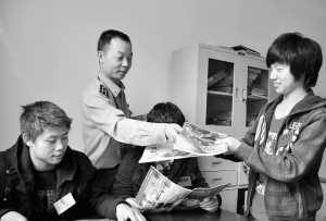 昨天上午,在嵊州市里南乡目测体检站内,众多应征青年在该市征兵办的流动图书室里阅读国防杂志。今天是嵊州市冬季征兵目测体检的第一天,该市征兵办首次推出国防流动图书室,组织了千余册图书让该市万余名目测体检的预征青年对国防文化知识进行“充电”。