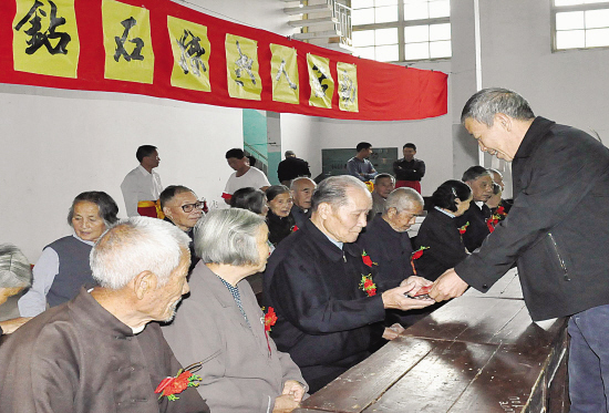 10月13日,嵊州市金庭镇华堂村为该村10对钻石夫妻举行了一个简单而隆重的重阳庆祝仪式。老人们胸佩红花,在社区中心观看了文艺演出,接受了老年协会的祝福和关爱,还获得了政府部门送来的敬老红包。 (记者 张亮宗 摄)