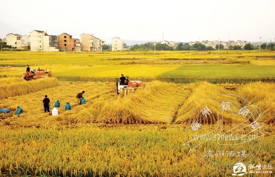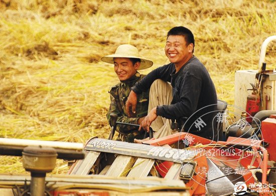 收获季节,收割机奔忙在金色的田野,收割速度极快。看来,农村的机械化程度提高了,农业的根本出路在机械化嘛!瞧,农民笑得多甜。