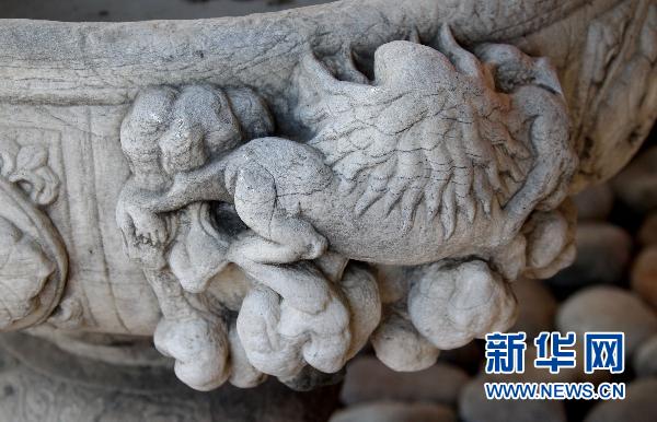这是圆明园回归文物石雕纹饰(9月27日摄)。当日,纪念圆明园罹劫150周年系列活动正式启动。其中,在已经开展的回归文物展上,包括雕花石洗、雕花石堆、雕花石桌、西洋石构件、石狮子等在内的57类85件石刻向游客开放。据介绍,圆明园流失在国内外的文物至少有150万件,大部分精华流失在海外。新华社记者汪永基摄