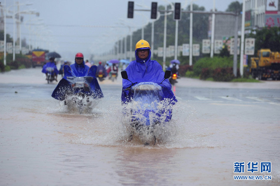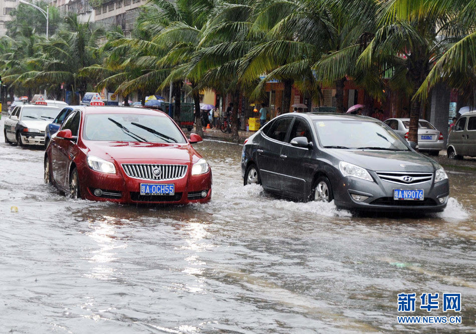 10月17日,海口市三西路严重积水,车辆缓慢前行。新华社记者 傅勇涛摄