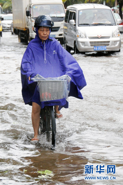 10月17日,海口市海甸岛积水严重,市民缓慢前行。 新华社记者 傅勇涛摄
